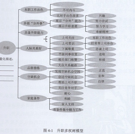另外,還有諸如保持耐心等許多其他必要條件、充分條件以及輔助條件。下面的升職多權(quán)樹(shù)可以為我們制定一個(gè)更系統(tǒng)的升職計(jì)劃提供進(jìn)步參考(見(jiàn)圖4-1)。