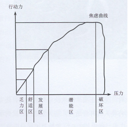就某一個具體的人來講,當壓力達到一定的程度,超過焦慮曲線的頂峰而處于破壞區(qū)時,會感到絕望,再也無力承受與支撐下去,于是,他的意識與潛意識會同時選擇放棄。此時他的行動力會突然遭到毀滅性破壞,驟然直線下降,直到為零。比如,他認為“這絕對不可能”而放棄努力,因過度緊張而動作變形,甚至一下被“嚇癱了”,因為承受不了巨大的壓力而精神失常等現(xiàn)象,即是因為壓力進入了他的“破壞區(qū)”的結(jié)果。